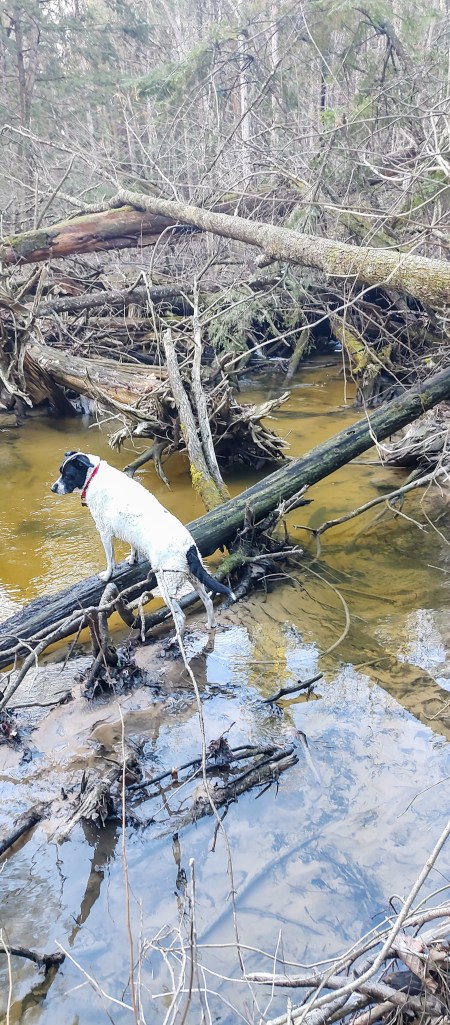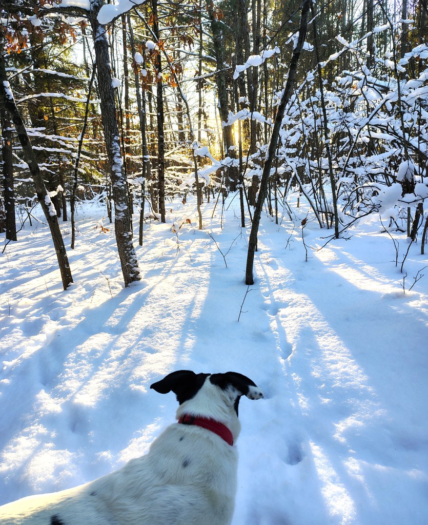 I wondered past my thinking log, where so many times I have contemplated many of life’s challenges. I trotted past the dog brushing station (still littered with my old dog hair), and warm thoughts of my hooman caring for me filled my heart. I ducked under the frog tree, now sloping into the water and groping at the river bank. The familiarity of knowing I will discover a tree frog clinging to it on summer days gives me hope for warmer days to come. I thought of my hoomans. The ones that are with me and those that have gone on to other adventures – and I thanked the woods for letting me enjoy all the time we had together there. As my mind continued to wander down memory lane, the sun began to set. I knew even daylight saving time couldn’t rescue me from the fact that my hiking time was up. So I bid good night to my woodland friends and turned my tail toward home, my heart full of hope for future memories I get to make.