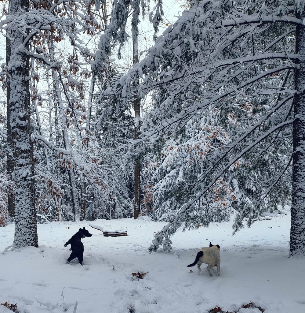I can always tell when something big is about to happen. The house smells different — a sweetness in the air like cinnamon sugar mixed with a faint whiff of anticipation. My hooman makes many trips inside and out, bringing in bags and bags of groceries. So many snacks that she has to store some on the back porch. Luckily, Michigan is basically one giant refrigerator this time of year, so we have plenty of space — bring on the treats!