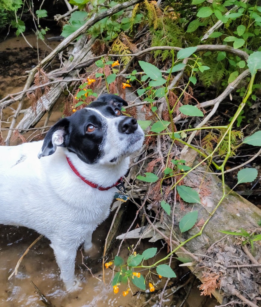 So, I shook off my anxiety and took matters into my own paws. Out I wandered alone into the forest. I was unsure at first. The snow covered trees cast new shadows and there was an eerie silence throughout the woods. As I turned down the path I scared up three whitetail deer (and they scared me too)! I watched their white tails bounce down the ravine and realized I was not the only explorer out today. There was a whole world of adventure awaiting me!